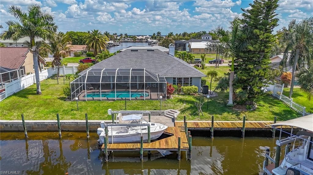Welcome to your dream waterfront retreat in the highly desirable Palaco Grande Sailboat access neighborhood! This home has never flooded. Property sits on a triple lot, offering unparalleled proximity to the river. With 120 feet of water frontage and a 26-foot wrap-around boat dock featuring a 10,000-pound lift, boating enthusiasts will delight in the convenience and luxury this home provides. Step outside to the refurbished pool cage and newly finished pool area featuring a pebble stone floor-a...Welcome to your dream waterfront retreat in the highly desirable Palaco Grande Sailboat access neighborhood! This home has never flooded. Property sits on a triple lot, offering unparalleled proximity to the river. With 120 feet of water frontage and a 26-foot wrap-around boat dock featuring a 10,000-pound lift, boating enthusiasts will delight in the convenience and luxury this home provides. Step outside to the refurbished pool cage and newly finished pool area featuring a pebble stone floor-a perfect oasis for relaxation and entertaining in the heated pool. Enjoy the convenience of an outside shower after a day on the water. With 2 pocketing sliders leading to the pool area, indoor-outdoor living is seamless and effortless. Families with furry friends will appreciate the fenced doggie area with convenient doggie doors. Cozy up on cool winter evenings by the fireplace, adding warmth and ambiance to the home. Inside, the upgrades continue with all-new luxury vinyl flooring throughout, except for the bedroom. The kitchen boasts new cabinets, level 5 granite countertops, and updated appliances,-perfect for culinary enthusiasts. This home has been meticulously maintained with a full professional repaint both inside and out. The AC is 7 years old, the hot water tank is 5 years old, and the roof is brand new as of 2024, ensuring years of worry-free living. Additional features include new blinds and window treatments, and the option for furniture to convey with the sale. Curious about the boat? Inquire about the possibility of including it in the sale. Don't miss this opportunity to own a slice of paradise in one of Cape Coral's most sought-after neighborhoods. Schedule your showing today and start living the waterfront lifestyle you've always dreamed of!